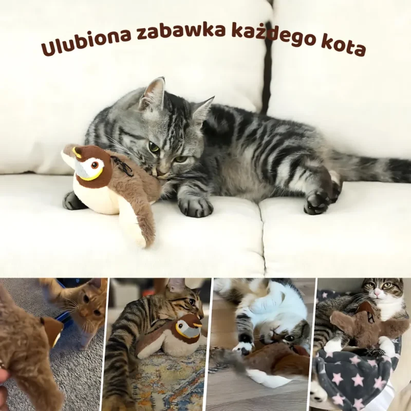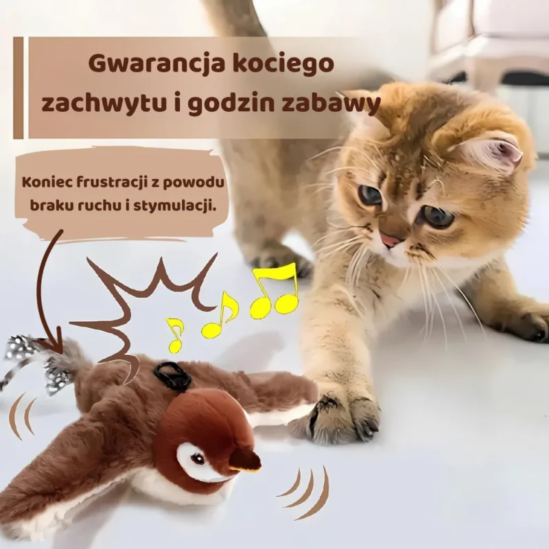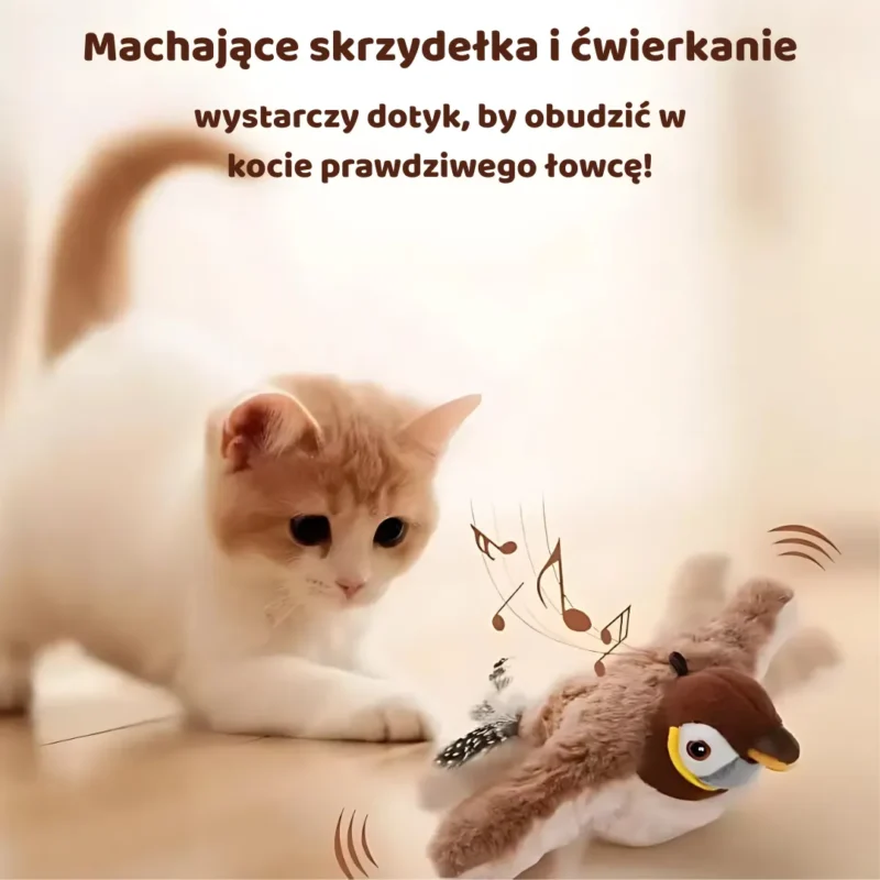 Realistyczne skrzydła i ćwierkanie angażują kota, zapobiegając nudzie i destrukcyjnym zachowaniom .
